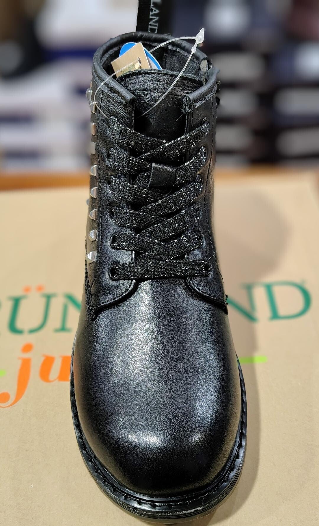 Anfibio in morbida pelle con inserti borchiati ,sottopiede in pelle e suola in gomma flessibile