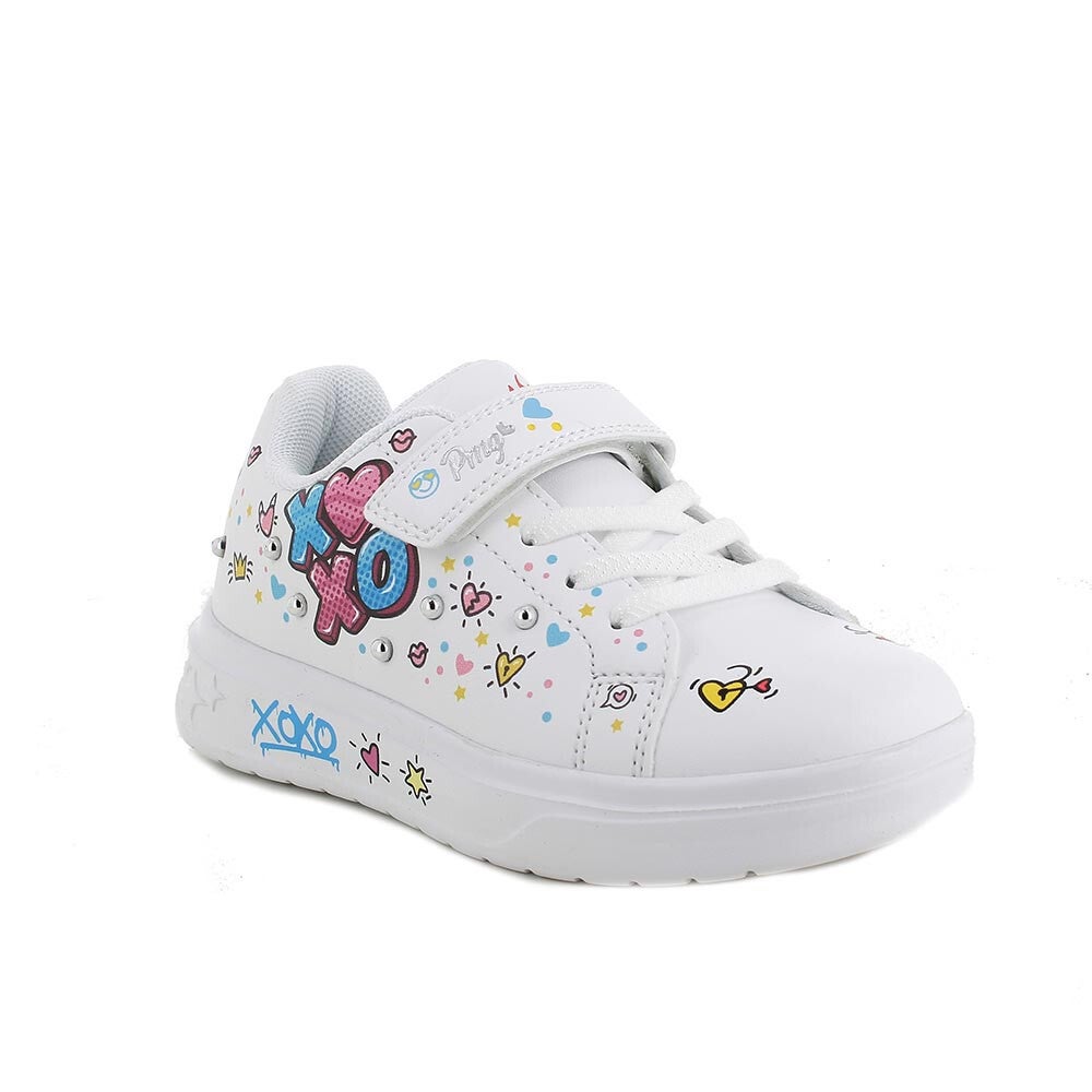 Sneaker con velcro e stringhe elasticizzate ,bianca con cuoricini colorati e borchiette.Sottopiede estraibile in pelle.